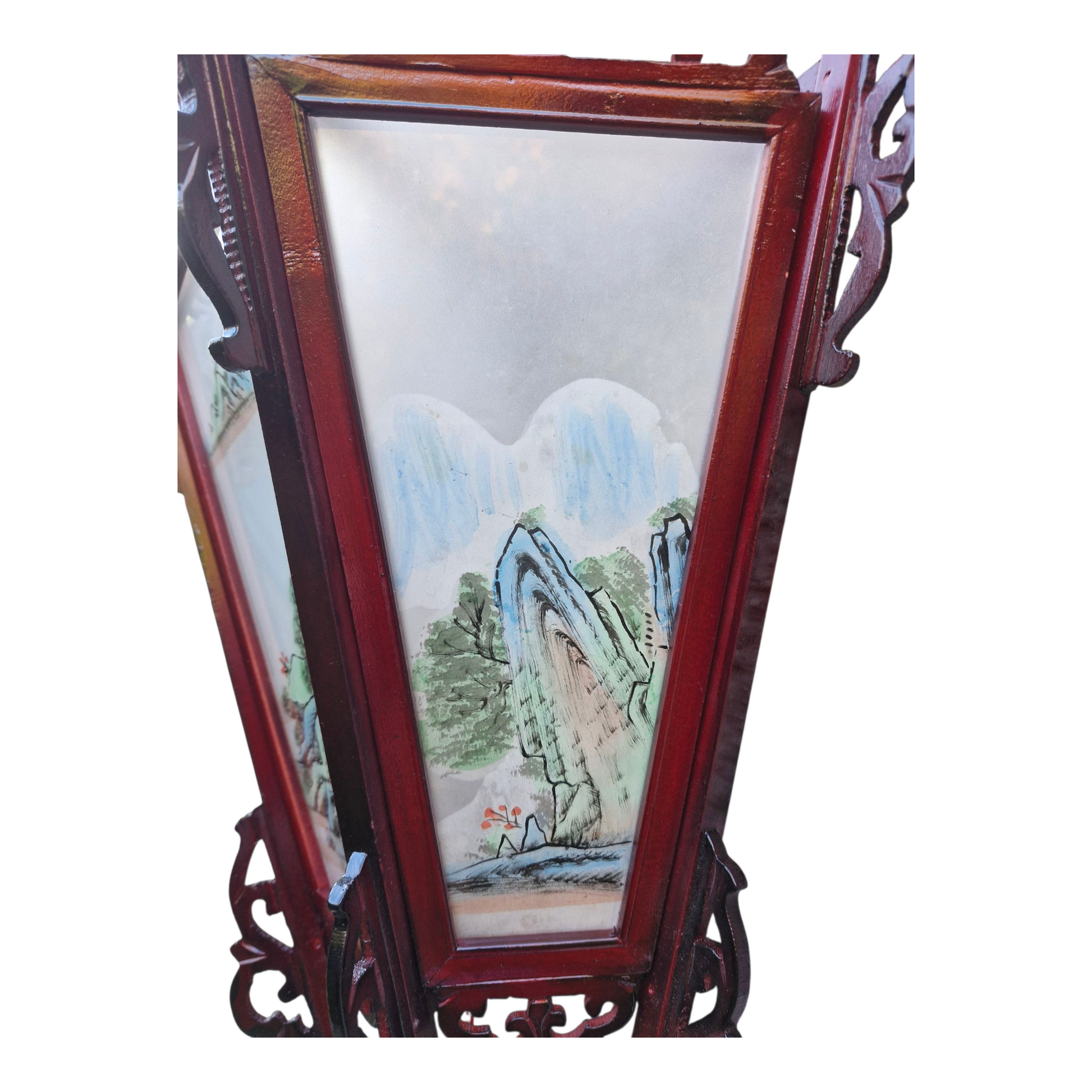 Each hand painted glass panel depicts a different Chinese landscape . The wood frame has intricately carved panels and fret work. Actual painting can vary due to the hand painted nature.