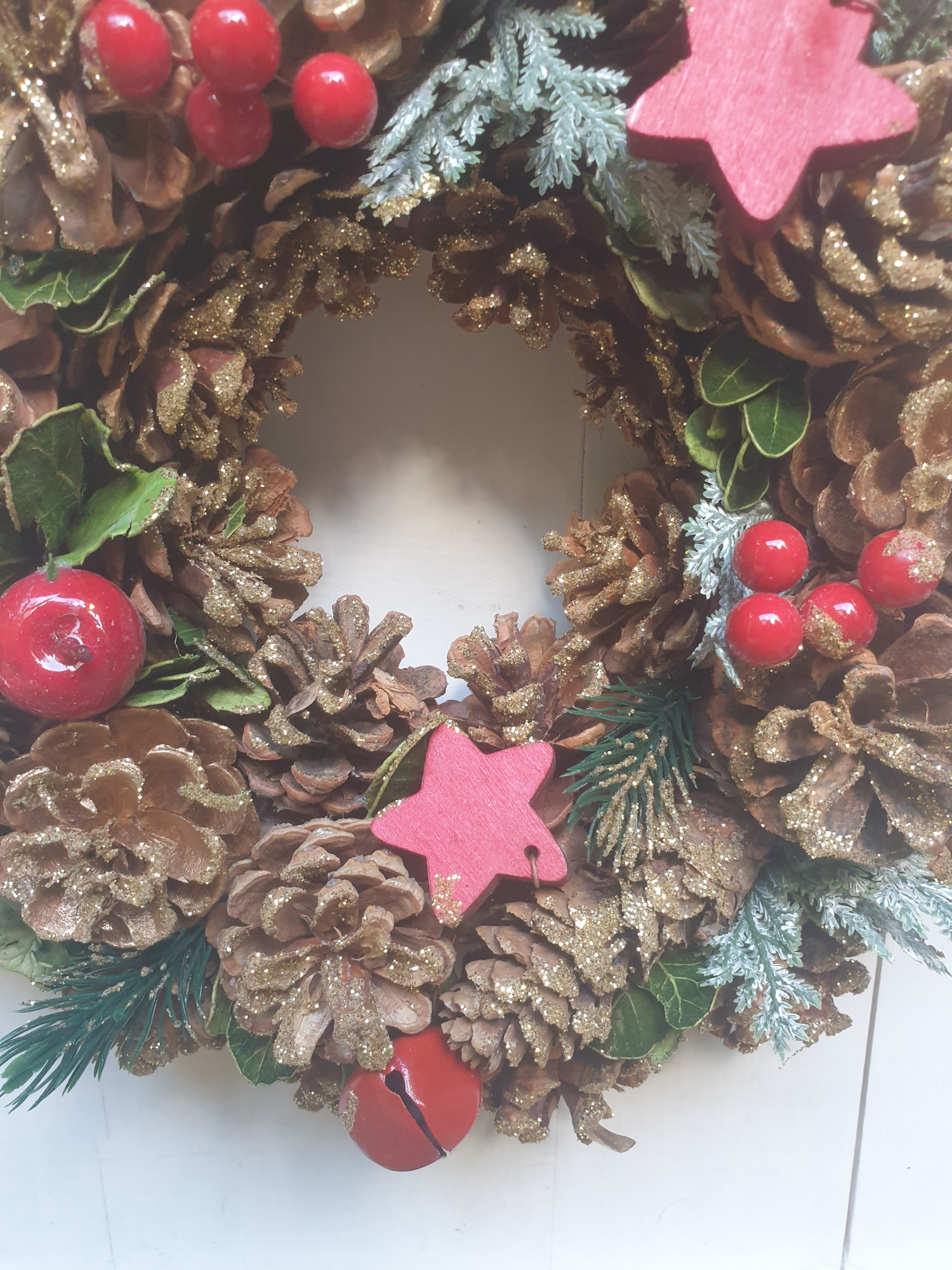Stunning wreath made from gold glittered pinecones with a faux foliage, red wooden stars and red metal bell
