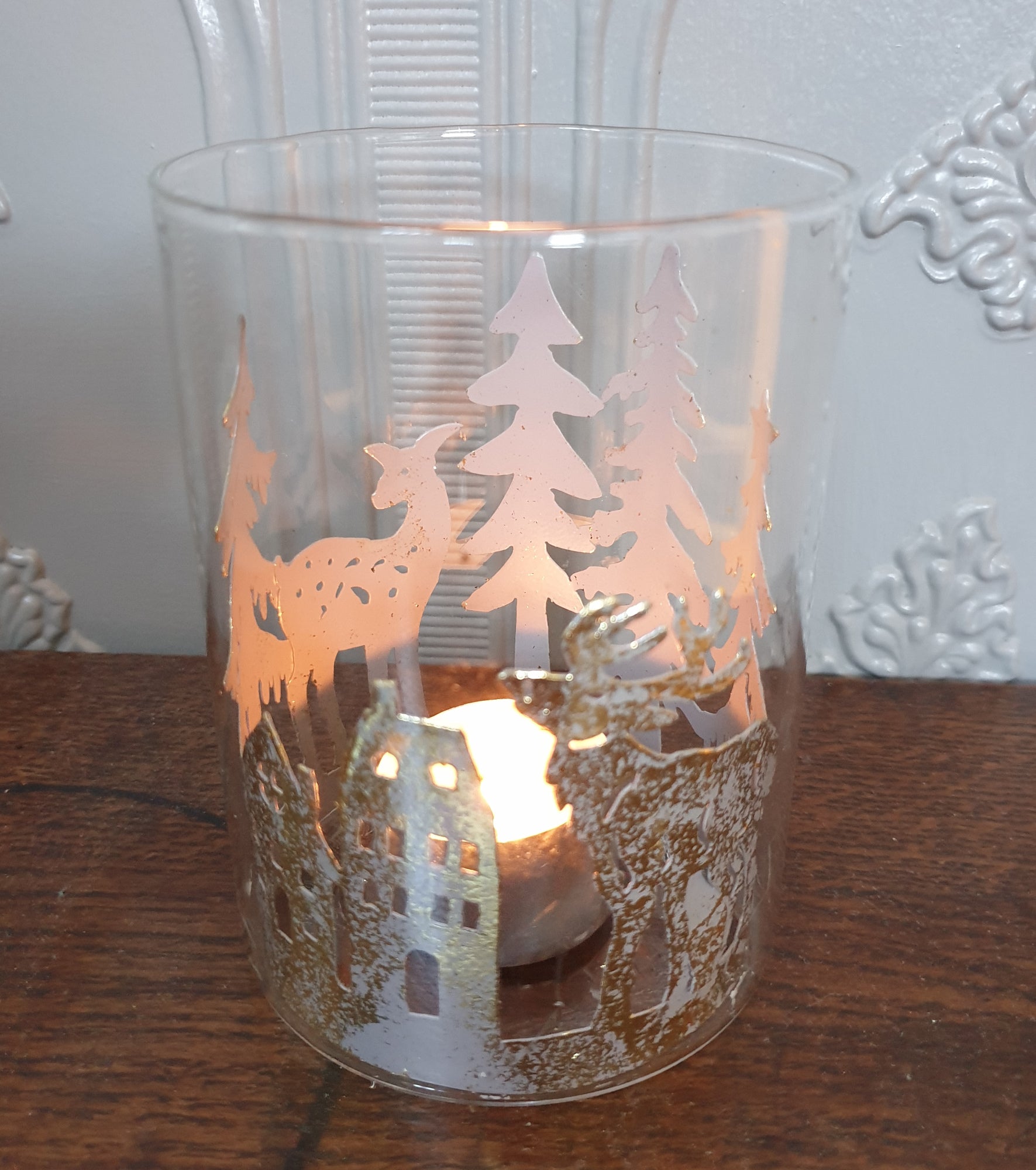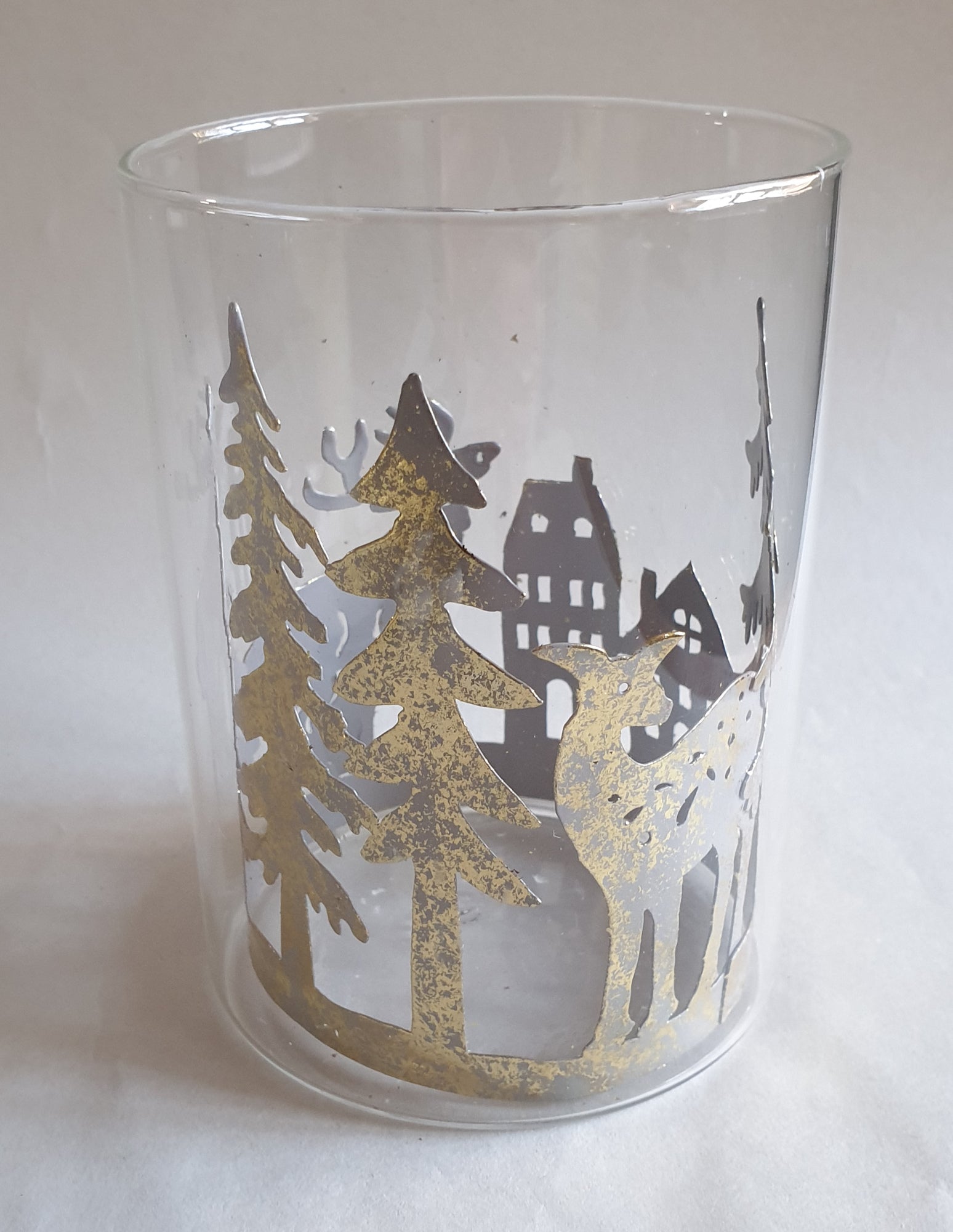 Delicate clear glass with a gold coloured metal insert with Reindeer and Christmas Trees