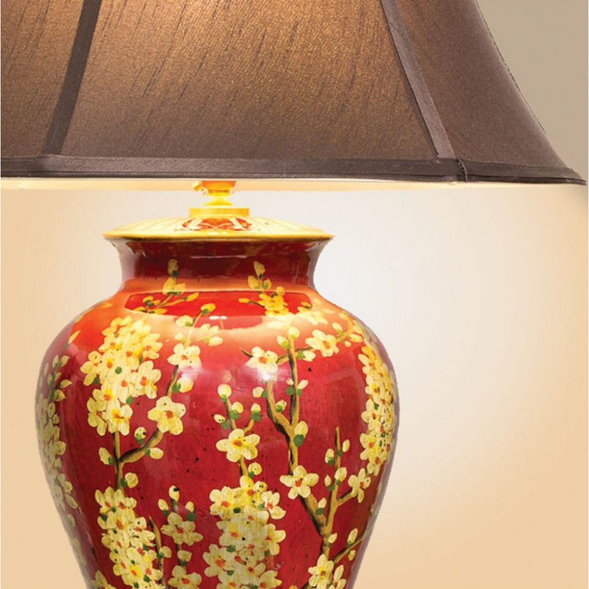 Pair of Chinese Jar Table Lamps with Dark Shades - Red Jasmine Blossom