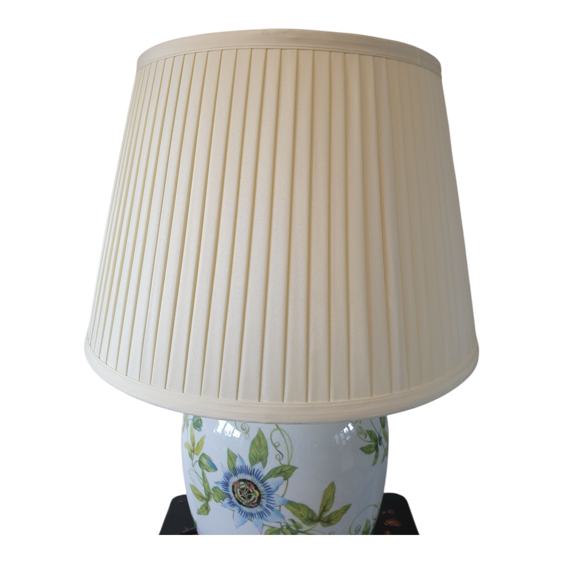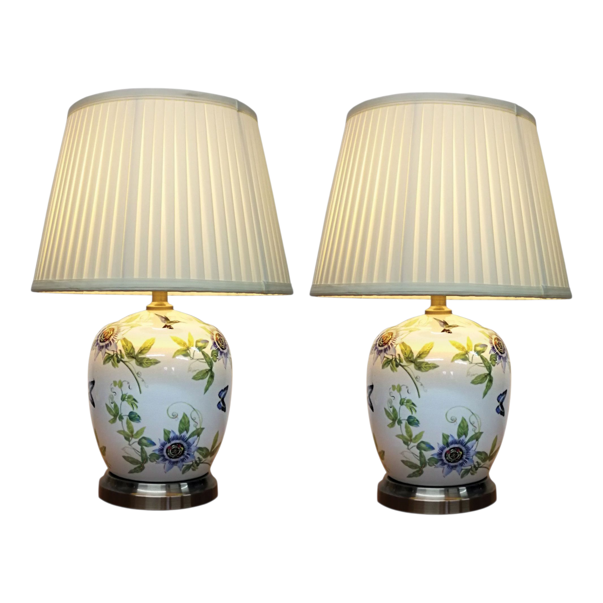 Pair of Chinese Table Lamps - White Passion Flower Pattern with Shades - 52cm