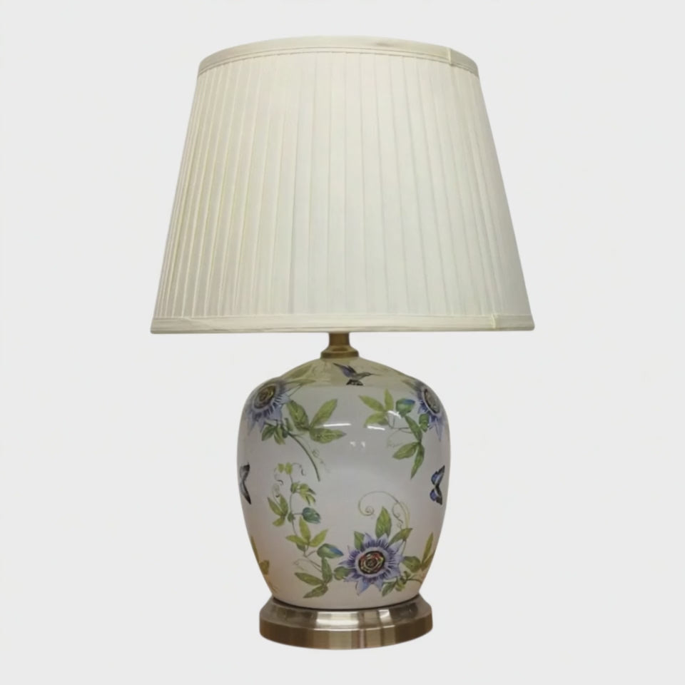 Pair of Melon Jar shaped Lamps in crackle-glazed white base decorated with a spreading passionflower vine attracting the attention of hummingbirds.