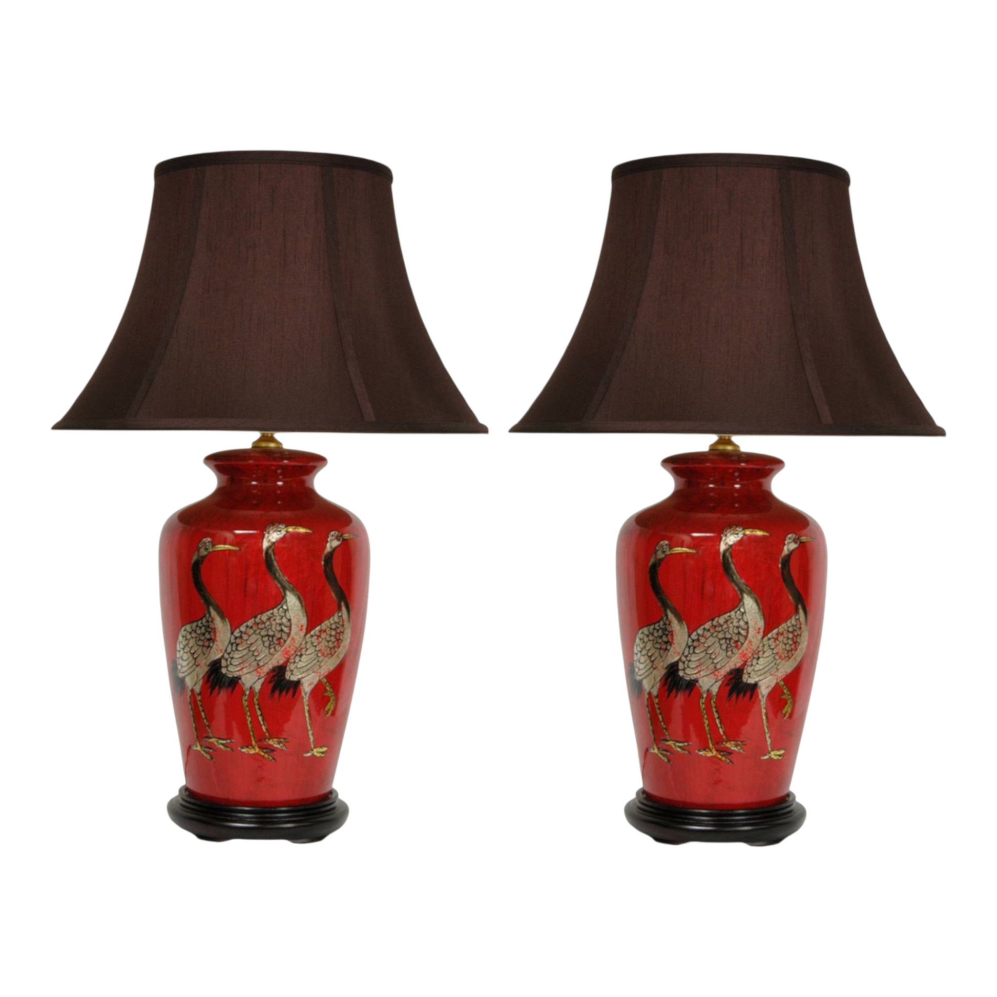 Pair of Chinese Table Lamps with Dark Shades - Red + Golden Cranes Pattern
