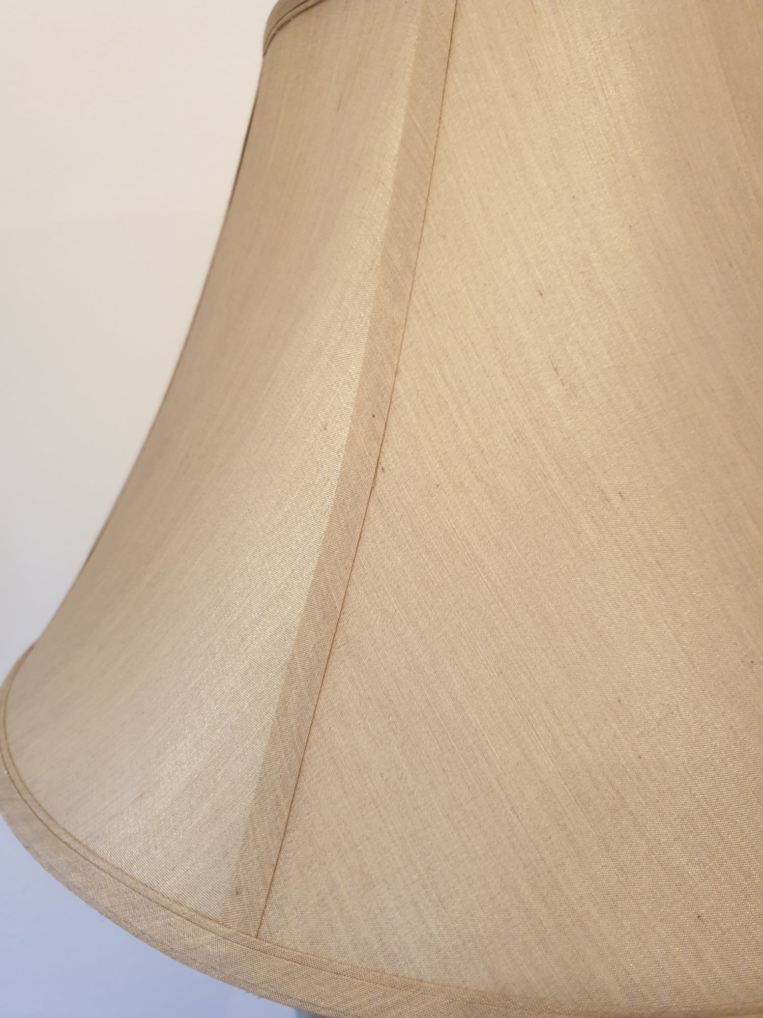 Constructed from a 35cm porcelain vase mounted on a hardwood stand and carrying a gold faux silk fully lined shade.