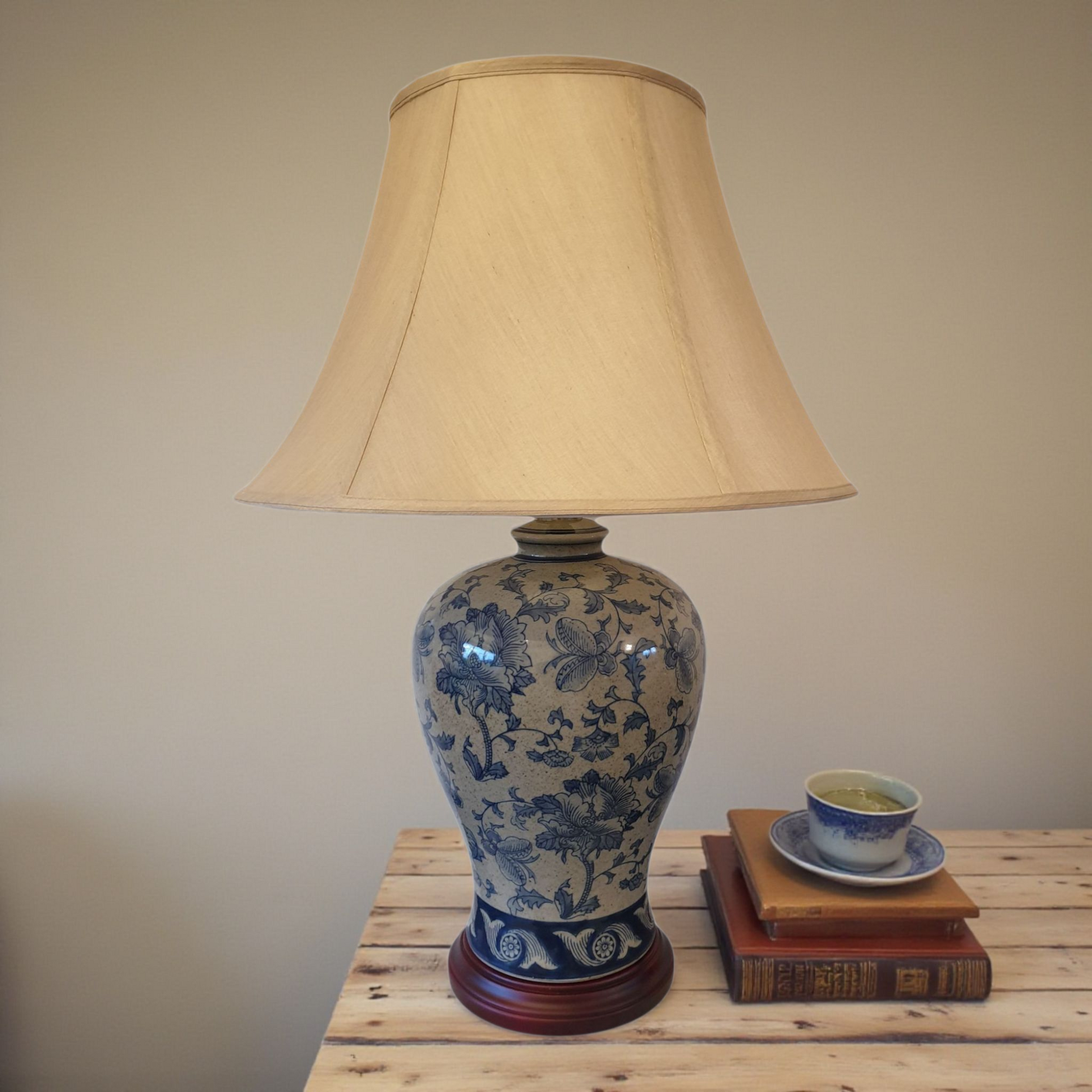 Pair of Chinese Vase Lamps with blue design of hibiscus leaves and flowers on a neutral biscuit background.